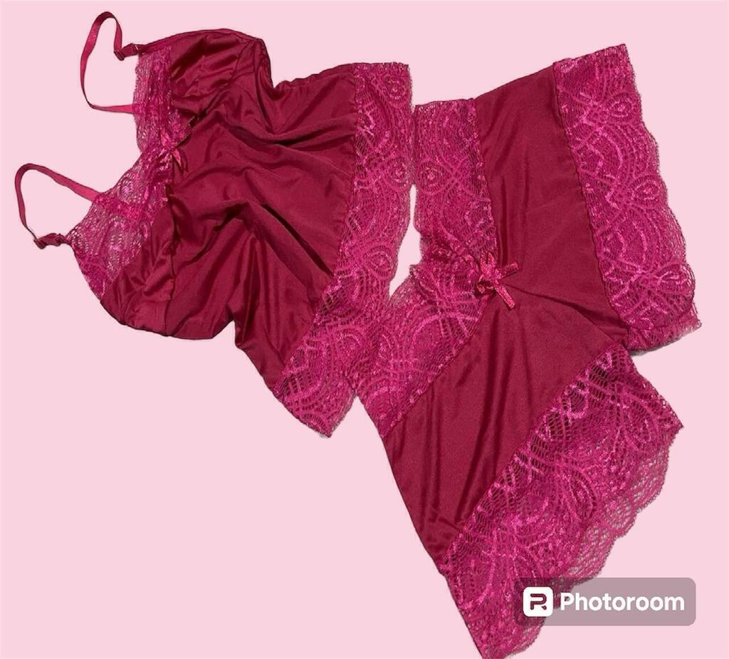 Um recorte no busto que dá um ótimo caimento, não possui bojo e tem alças reguláveis e detalhes em laço com renda. O short tem elástico na cintura.